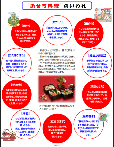 お節のいわれを、それぞれに込められた願いを理解し。