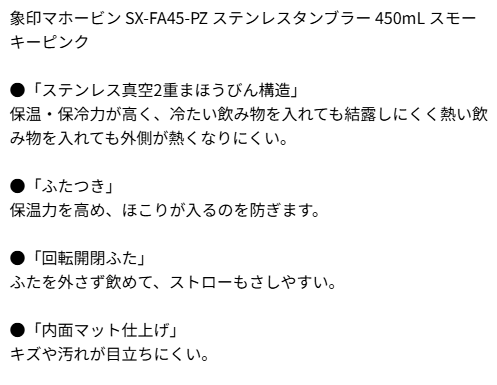 象印マホービン SX-FA45-PZ ステンレスタンブラー 450mL スモーキーピンク 価格:2310円 |